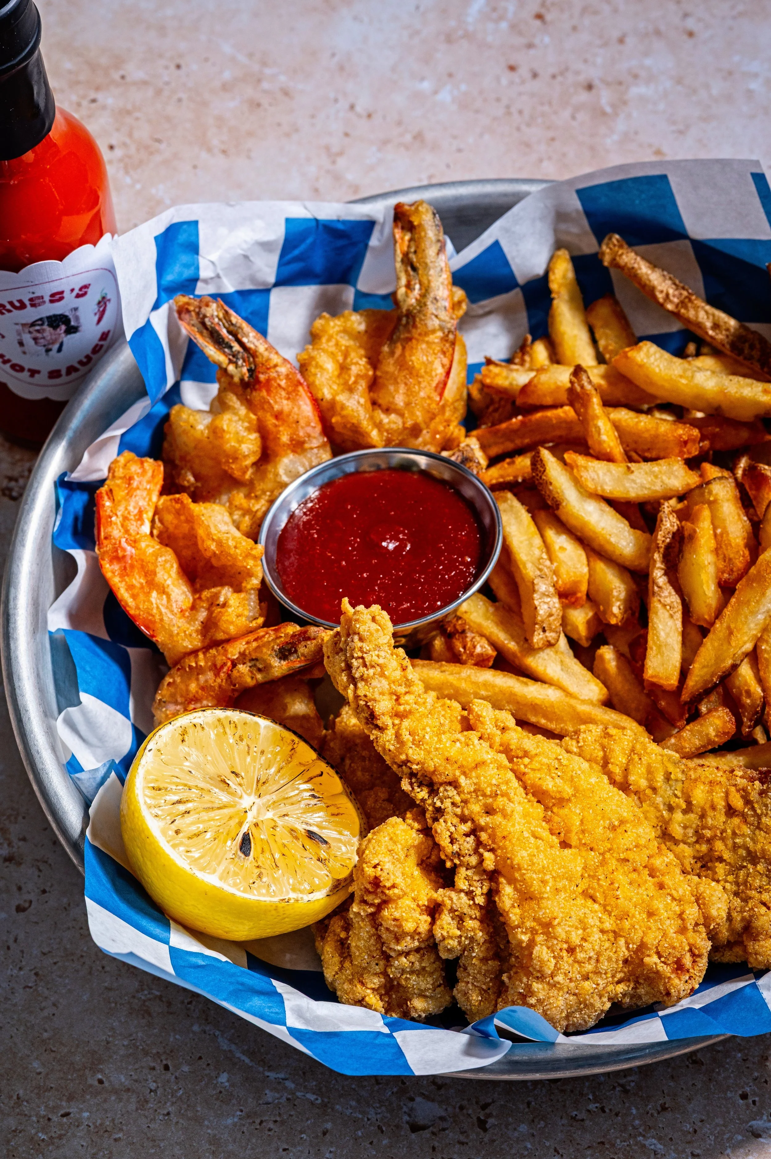 Pan-fried cornmeal-crusted catfish & jumbo fried shrimp, fries, coleslaw, pickle & hot sauce