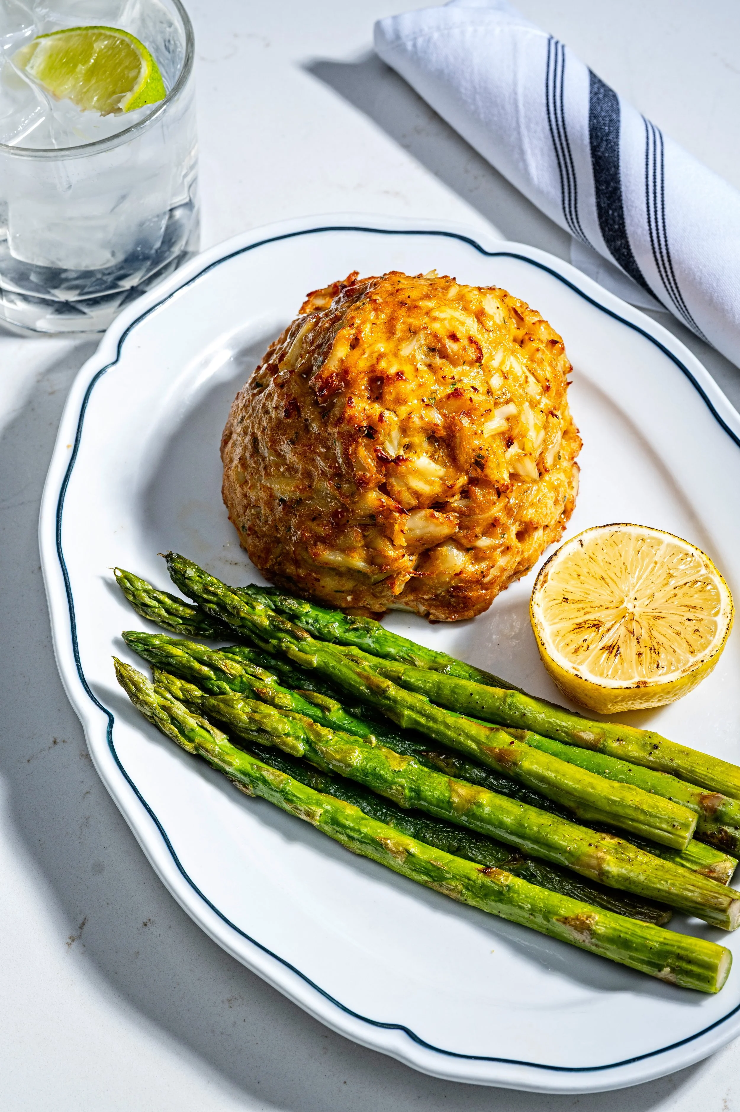 Herb-marinated chicken breast paillard topped with crab imperial, broiled in cast iron, served with jumbo asparagus & smashed potatoes | $55